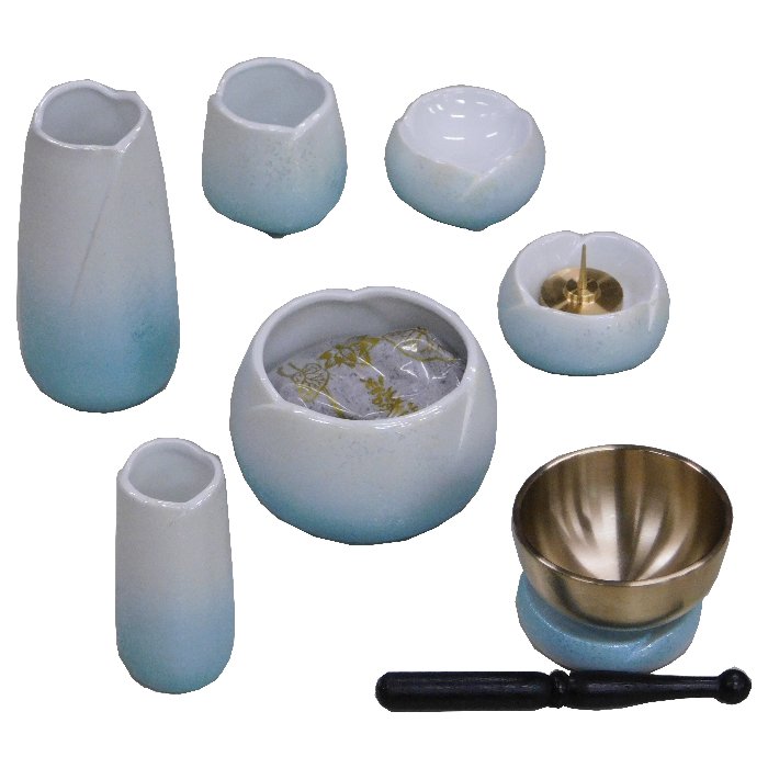 仏具 陶器製 仏具セット 七点 やわらぎ 中 ラスターブルー 送料無料 リン付 香炉 花立 火立 仏器 茶湯器 7点 モダン 仏壇 ペット 小型