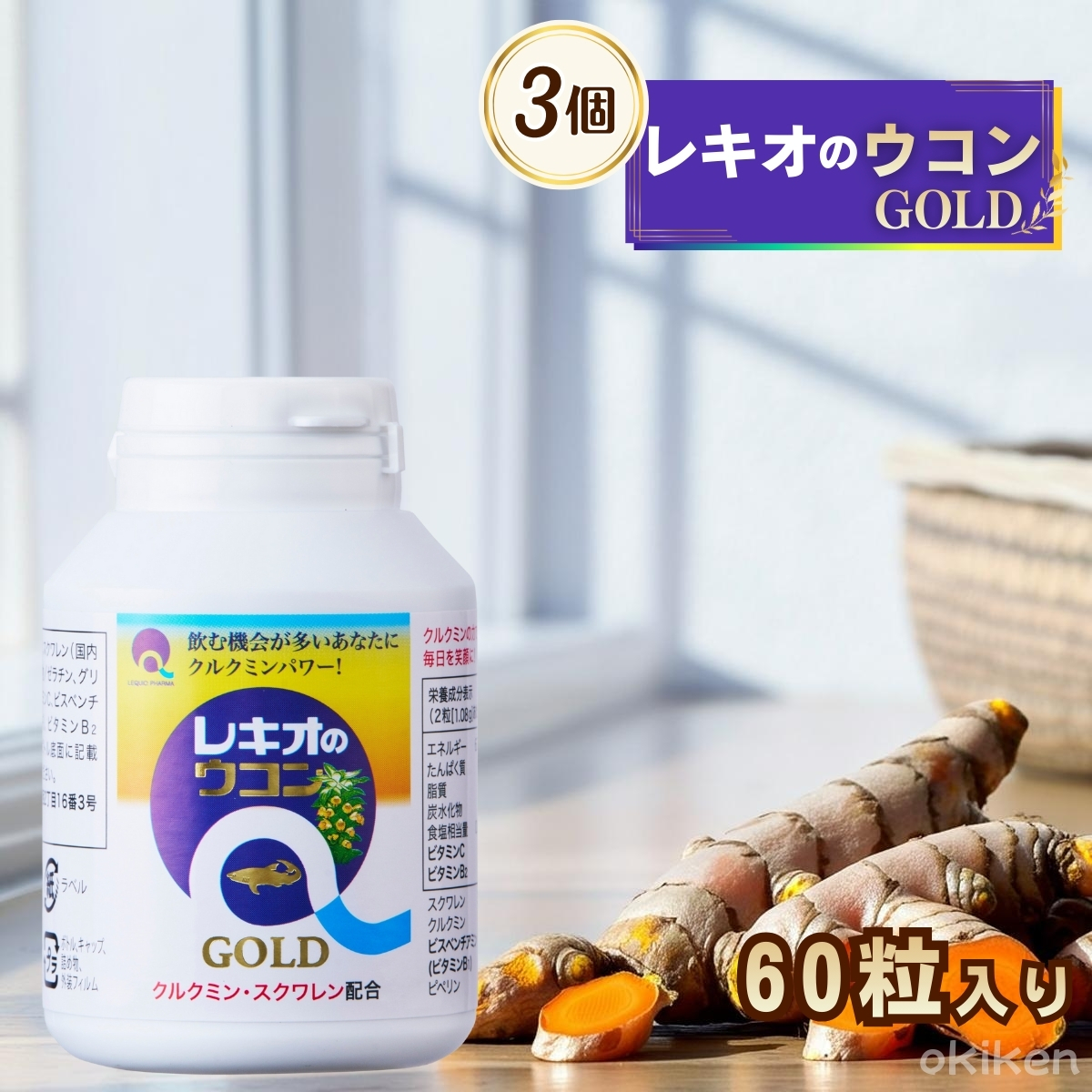 クルクミン サプリ レキオのウコンGOLD 60粒×3個セット ボトルタイプ スクワレン 秋ウコン 黒胡椒抽出物 ピぺリン ソフトカプセル 送料