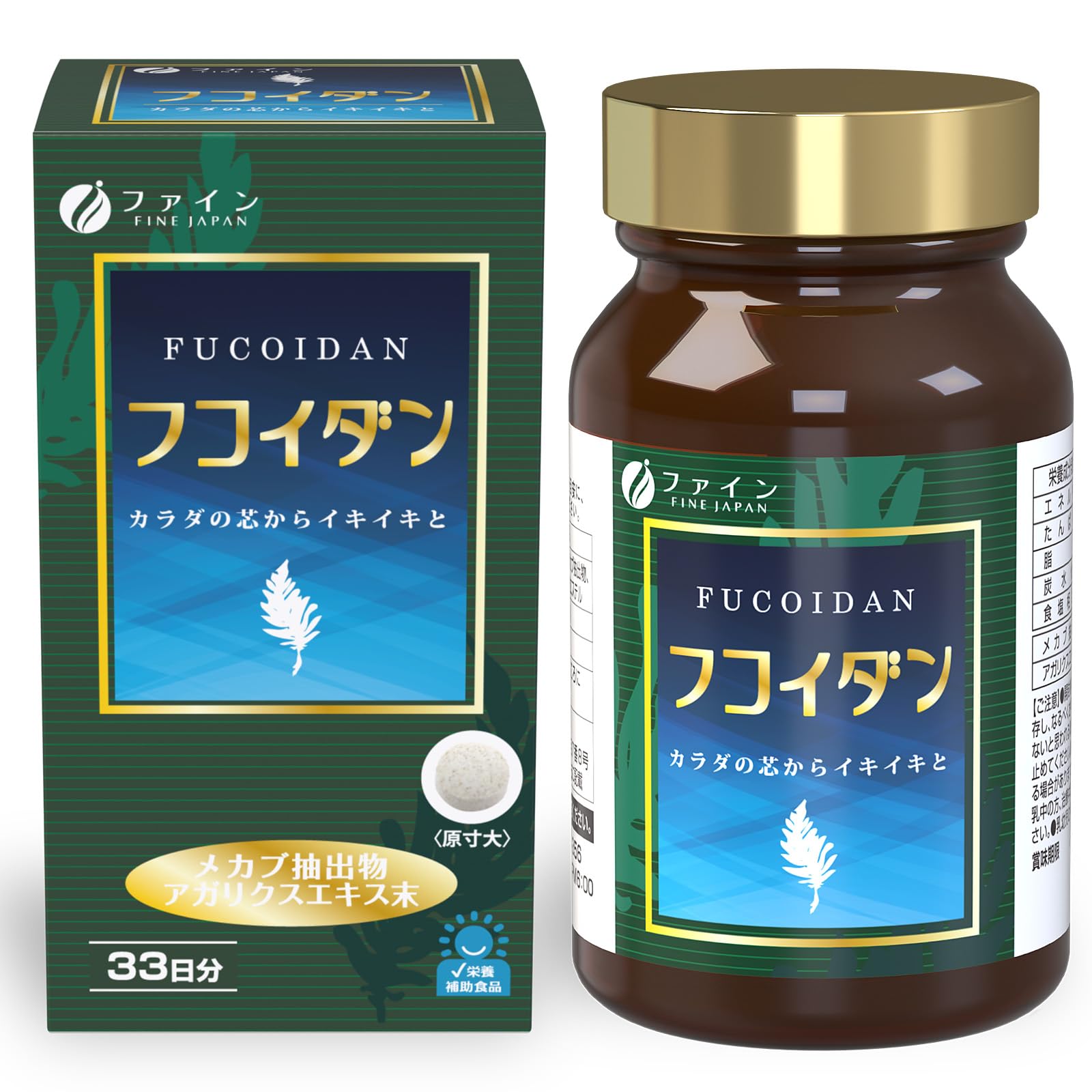 * フコイダン含有量: 40g/ビン (250 mg/ カプセル)* アガリクス菌糸体含有量: 4g/ビン (25 mg/カプセル)* 360 mg x 160 カプセル/ビン* 3種類の褐藻類(モズ...