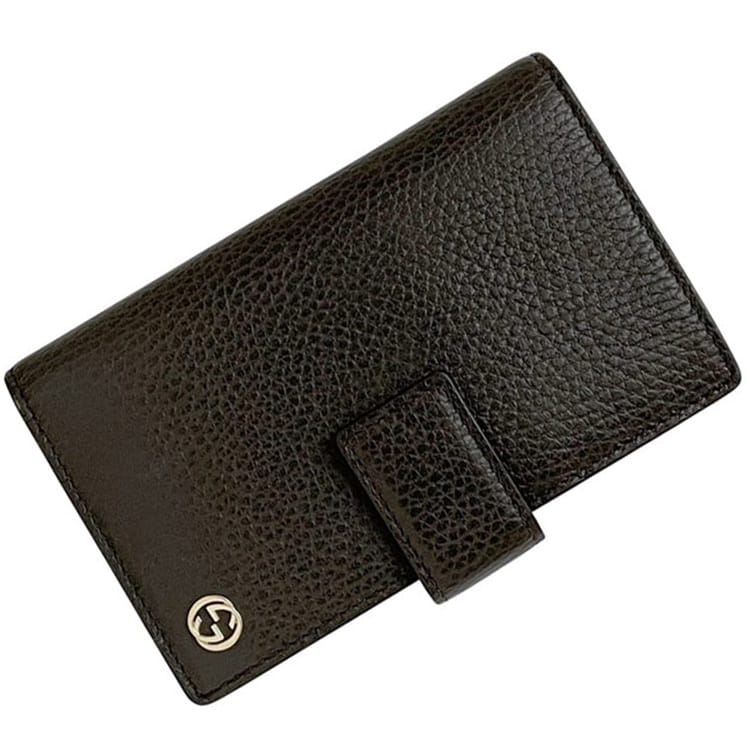 グッチ 三つ折り 財布 ブラウン インターロッキング 449344 美品 札入 レザー 中古 525040 GUCCI GG ロゴ 金具 カードホルダー ホック グ