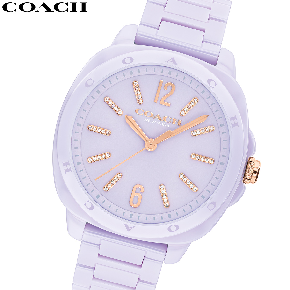 クリスタルベゼルがきらめくこのセラミックブレスレットデザインは、立体的なトーンのスティック マーカーとスイープ秒針で装飾されたラッカーダイヤルが特徴です。【コーチ COACH 2025 新作】...