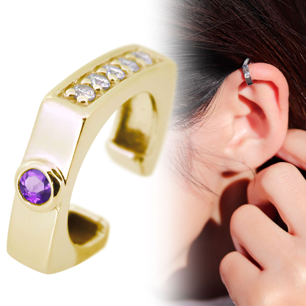 イヤーカフ レディース 18金 18k 片耳用 イヤカフ 2月誕生石 アメジスト ノンホールピアス 2way