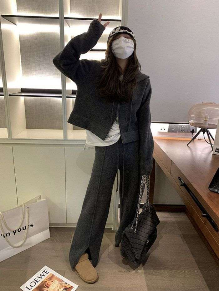 フード付きジッパーセーター カーディガン ニットスーツ レディース2024年秋冬新品カジュアルファッションワイドレッグパンツツーピース