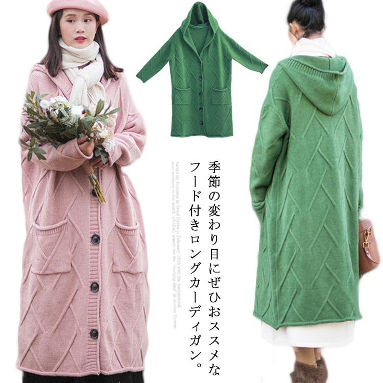 フード付きロングカーディガン ざっくり編み カーディガン ロング ニットコート コーディガン ボタン開き セーター ロングカーディガン
