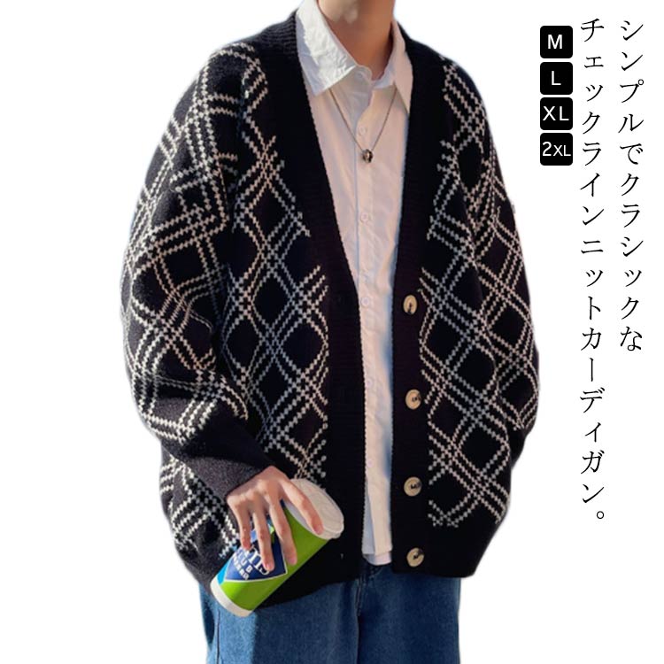 ニット カーディガン チェック柄 総柄 メンズ 秋 冬 厚手 ニットカーディガン Vネック アーガイル柄 ニット カーデ 羽織り アウター オー