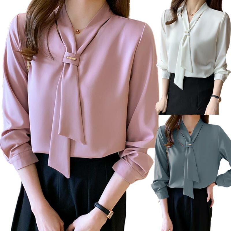 シャツ ブラウス レディース リボン トップス パフスリーブ Vネック 落ち感 魅力 お洒落 プルオーバー 長袖 無地 エレガント オフィス 通