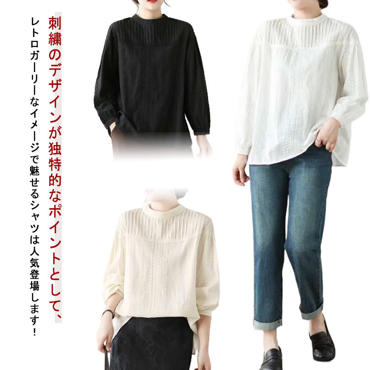 シャツ 可愛い 刺繍ブラウス プルオーバー トップス 森ガール ブラウス パフスリーブ レース コットン混 刺繍 リネンタッチ きれいめ シ