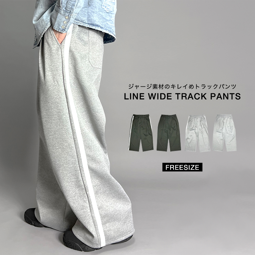 ■コメント ジャージ素材のライントラックパンツ。 ワイドシルエットでゆるさを出しつつも、ツータック入りで上品な印象に。 生地感は柔らかく、ストレスフリーな風合いです。 程よいハリ感があり、着用時のシル...