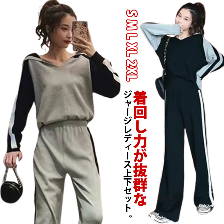 ジャージ レディース セットアップ レディース パンツセット パーカー きれいめ カジュアル おしゃれ Vネック ジャージ ワイドパンツ ハ