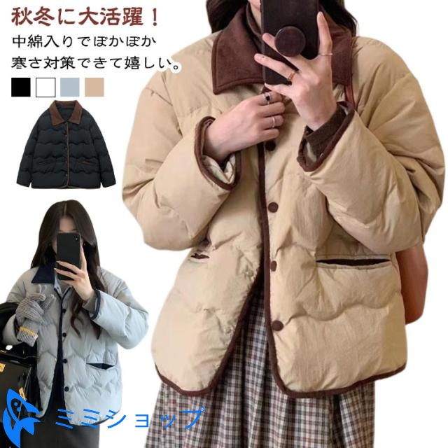 中綿ジャケット レディース リバーシブル ノーカラー チェック柄 秋 冬 春 ブルゾン ジャケット アウター コート ジャンパー 無地 シンプル ゆったり 羽織 大きいサイズ 可愛い中綿ジャケット レ...