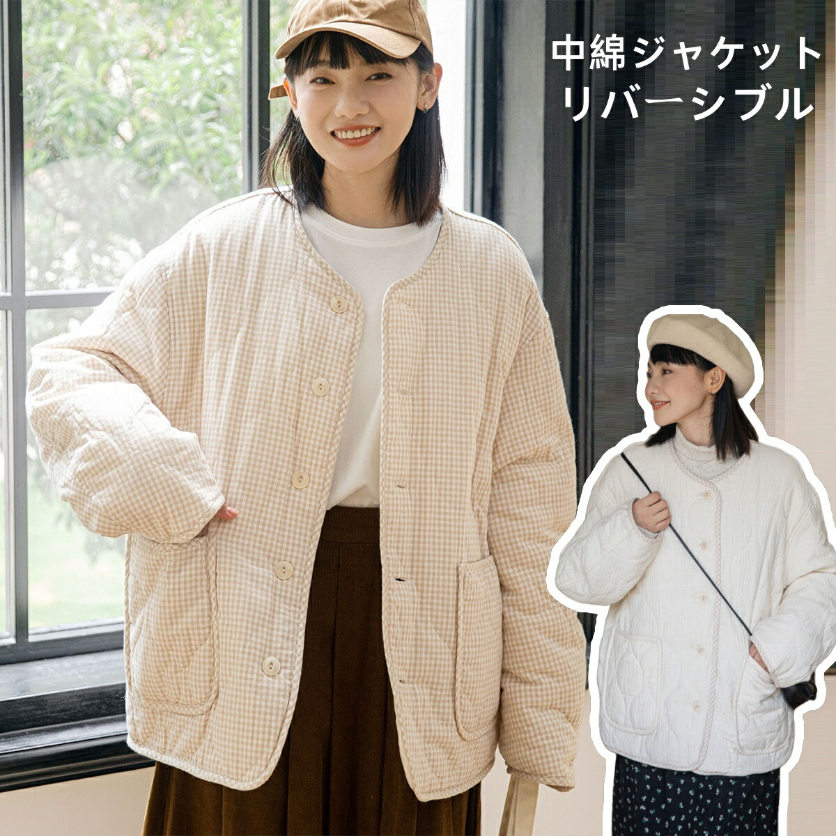 中綿ジャケット レディース リバーシブル ノーカラー チェック柄 秋 冬 春 ブルゾン ジャケット アウター コート ジャンパー 無地 シンプ