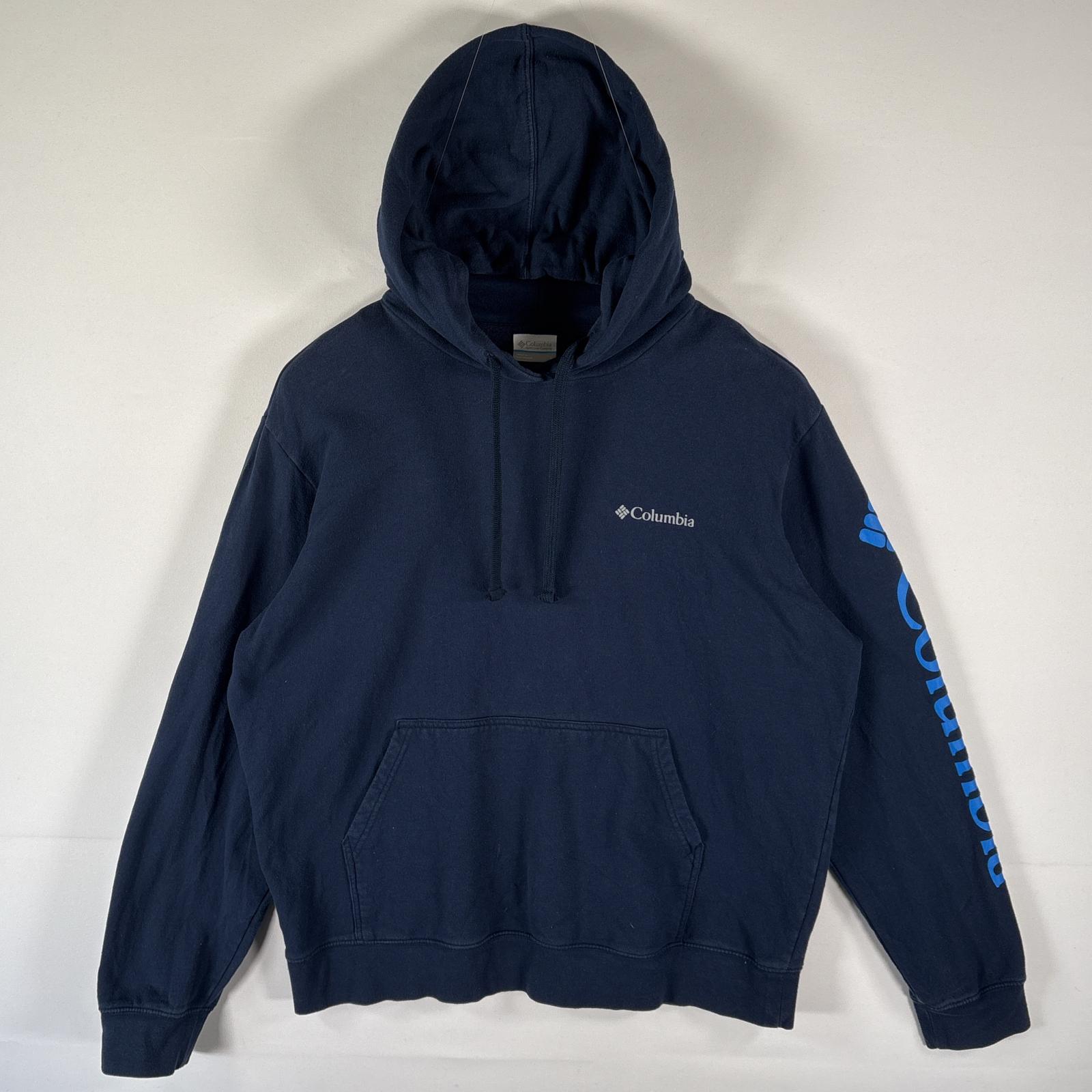 古着 コロンビア Columbia パーカー 袖ロゴプリント ワンポイントロゴ スウェット フーディ プルオーバー アウトドア L ネイビー メンズ