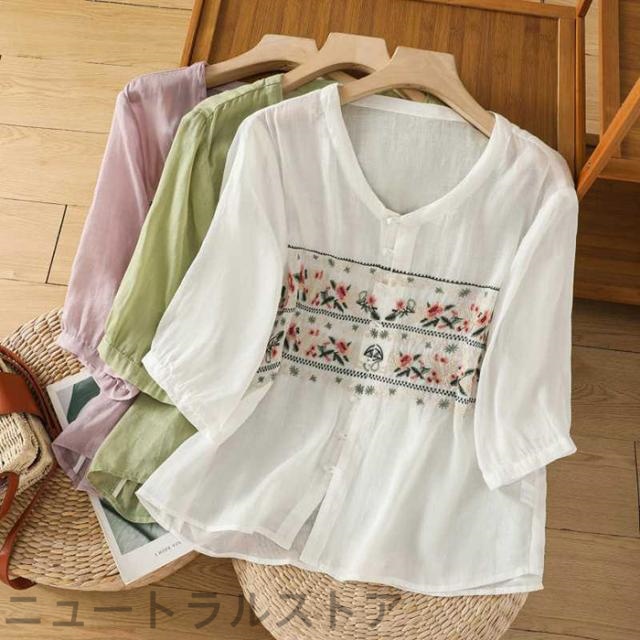 エスニック ブラウス レディース 夏 7分袖 前開き 花柄 刺? Tシャツ クルーネック 綿麻風ブラウス トップス 大きいサイズ 体型カバー 爽やか ファッション おしゃれ 大人 カジュアル きれいめ...
