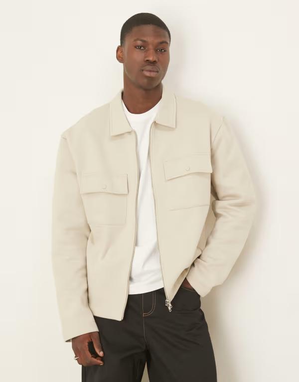 エイソス メンズ ジャケット・ブルゾン アウター ASOS DESIGN premium heavyweight oversized zip up shacket in 400gsms in beige Pelic