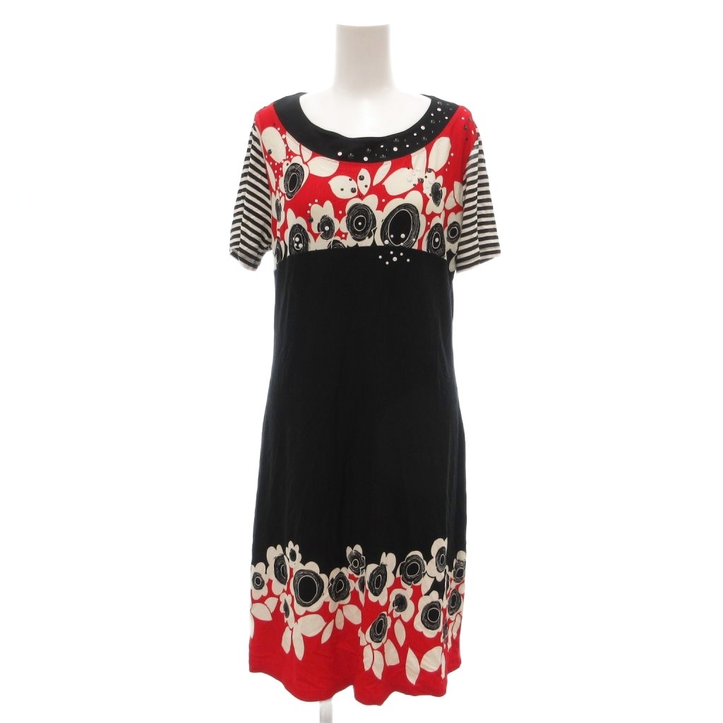 【中古】DONNE DE SOGNO 美品 ワンピース ひざ丈 黒 ブラック 赤 レッド 半袖 花柄 ラウンドネック /NL ■GY59