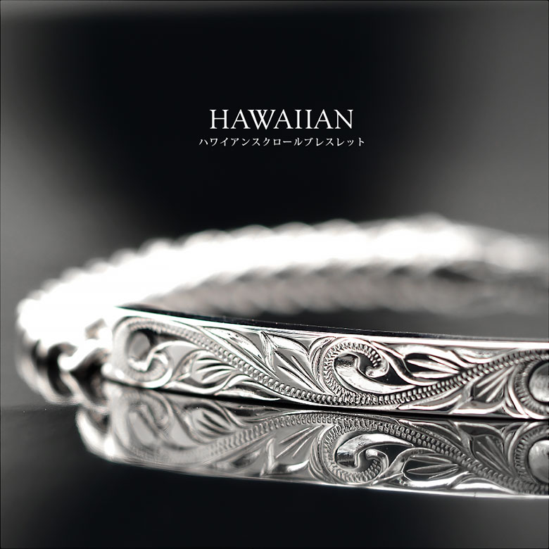 シンプルなプレートに波をデザインしたスクロール模様が一面に彫り込まれたシルバー925製のハワイアンジュエリーブレスレットです。ハワイアンジュエリーの模様には意味が込められており、ファッションのデザイン...