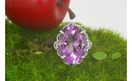 深く鮮やかな色彩の大粒アメジストを使ったペンダントです。 ルースは12.0mm×10.0mmと見ごたえも十分。 花や果実をイメージした枠に乗せ、どんなシーンにもさわやかな印象を加えてくれるデザインです...