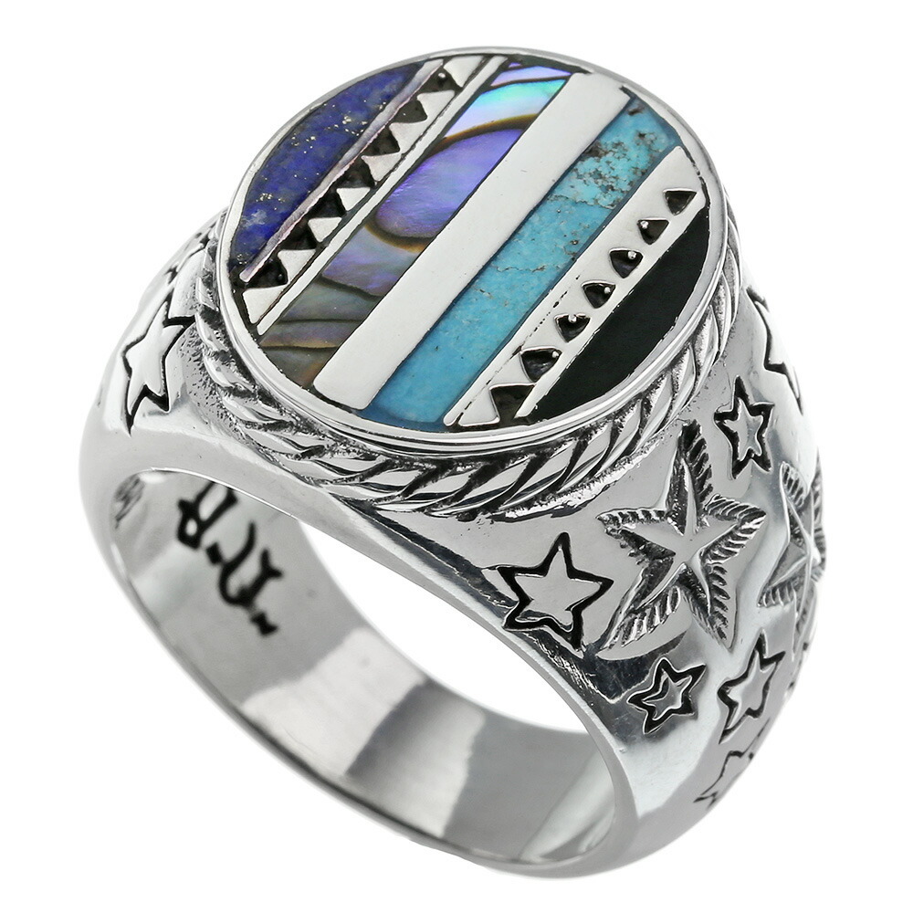 インレイ技法によって様々な天然石が埋め込まれたリング。ラピスラズリ、ターコイズ、シェル、オニキスがロープで囲われた楕円の中に並べられています。側面にはネイティブ系のスターをデザイン。ネイティブ系アクセ...