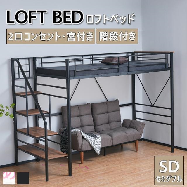 ロフトベッド 階段付き パイプベッド シングル セミダブル ロータイプ 耐荷重150kg 高さ130cm 宮 コンセント付き ハンガ4本付き 左右交換 高いベッドド ロフトベッド 大人用 ロータイプ 収...