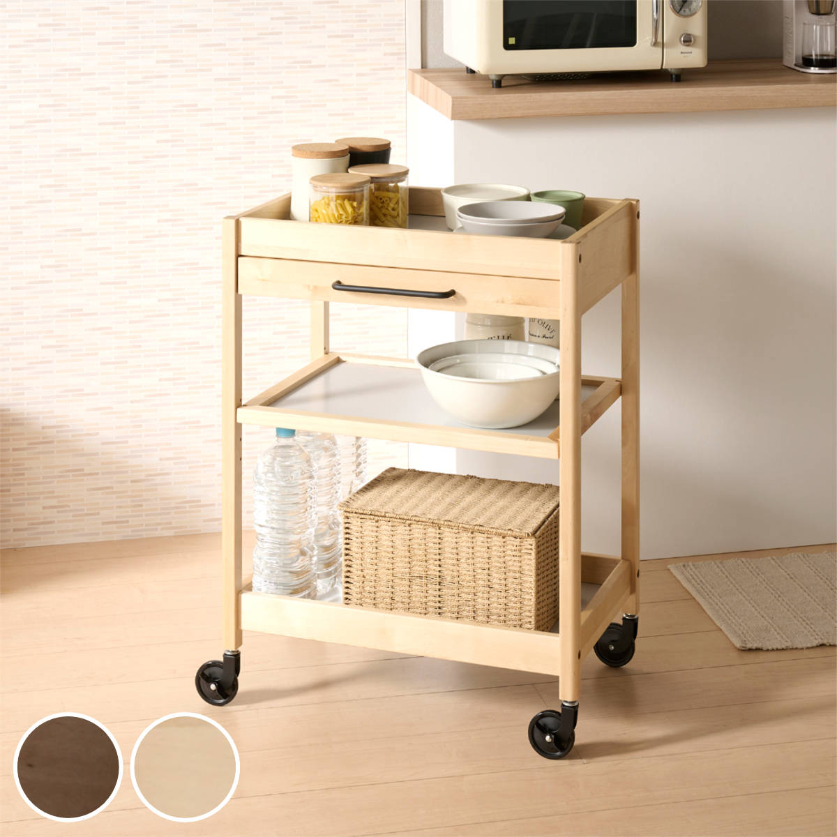 キッチンワゴン 幅60cm TORE 引き出し付き 天然木 可動棚 キャスター付き ( ワゴン 木製 リバーシブル棚板 両面 3段 メラミン天板 トー