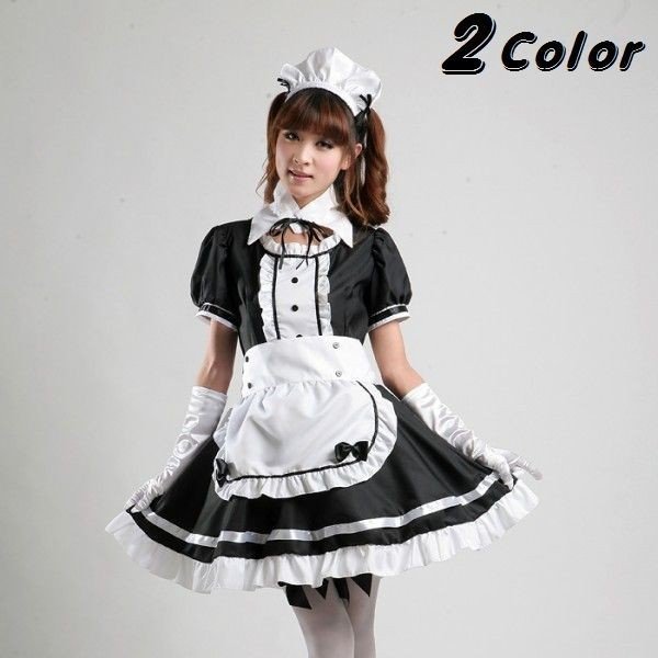 メイド服 4点セット ゴスロリ 半袖 ミニ丈 ショート丈 ヘッドドレス エプロン 付け襟 コスチューム コスプレ レディース ゴシックロリー