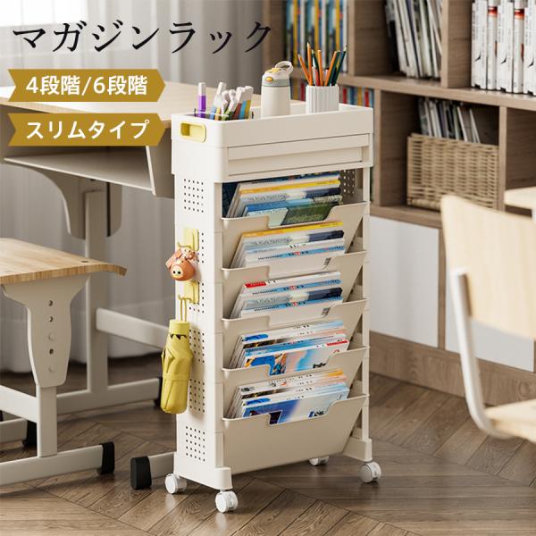マガジンラック 6段階スリムタイプ 省スペース キャスター付き 大容量 工具不要 書類収納ラック ファイルワゴン ロック機能付き 簡単組み