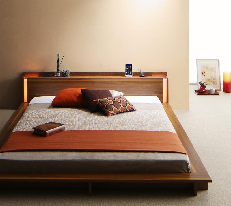 棚・コンセント・照明付きフロアベッド ダブル タクナ 照明付き すのこ板目仕様 ヘッドボード付き ローベッド フロアベッド 代引不可