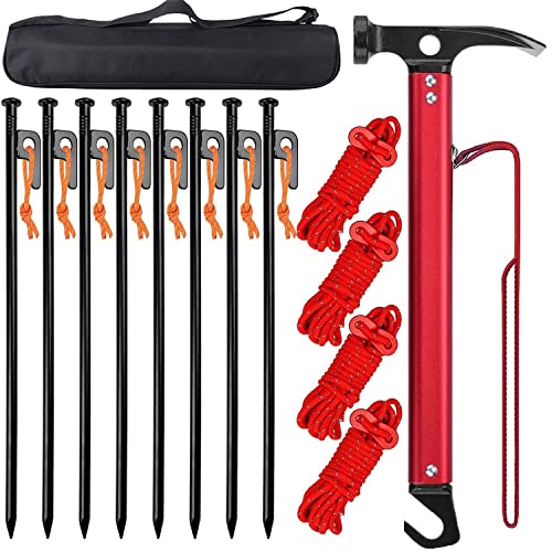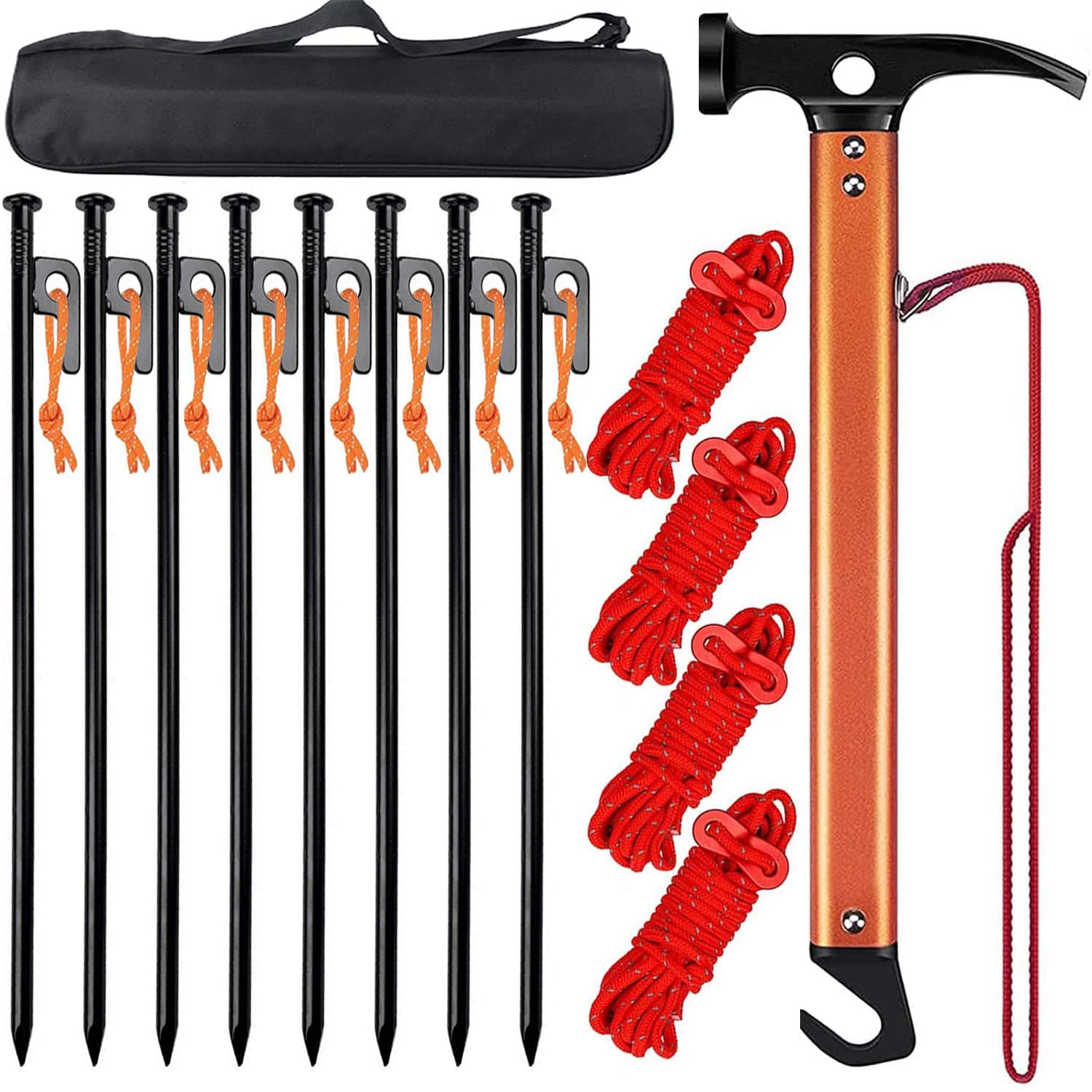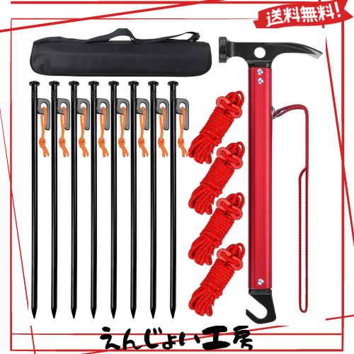 【強化版】 ペグハンマー HUNDRUP キャンプハンマー テントペグ 30cm 8本 反射材入りロープ付き 高炭素鋼 ハンマー 固定用リベット追加