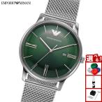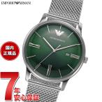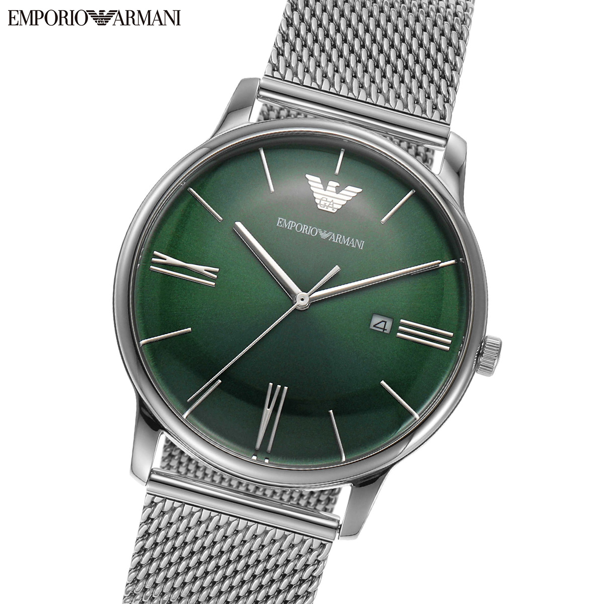 42mm径のケースにデイト表示付き三針ムーブメントを搭載した、Emporio Armaniのウォッチ。グリーンのサンレイダイヤルに、ステンレススチール製メッシュブレスレットを組み合わせました。【エンポ...