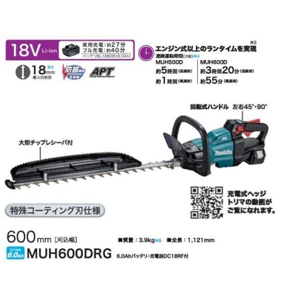 マキタ 生垣バリカン 充電式18V 刈込幅600mm/切断径18mm 6Ahバッテリ・充電器付 MUH600DRG