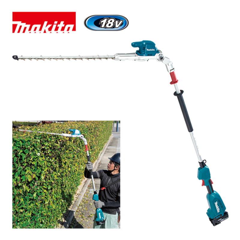 高所や奥行きのある生垣の剪定に。 軽量・低騒音・パワフル エンジン式を超える使用感※充電式ポールヘッジトリマ MUN500WDRG[角度可変] 標準小売価格(税別) バッテリBL1860B・充電器DC...